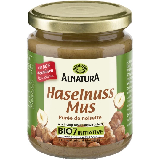 Ein aromatisches Mus aus hundert Prozent Haselnüssen. Die Nüsse werden geröstet und entfalten dadurch ein besonders intensives Aroma. So eignet sich das Mus als Brotaufstrich, kann aber auch Kuchen und Süßspeisen verfeinern sowie Dips und Saucen eine nussige Raffinesse verleihen. Das Alnatura Haselnussmus stammt aus Bio-Landbau und ist vegan. Es enthält keinerlei Zusätze, daher kann sich produkteigenes Öl absetzen. Durch Umrühren wird das Mus wieder cremig.